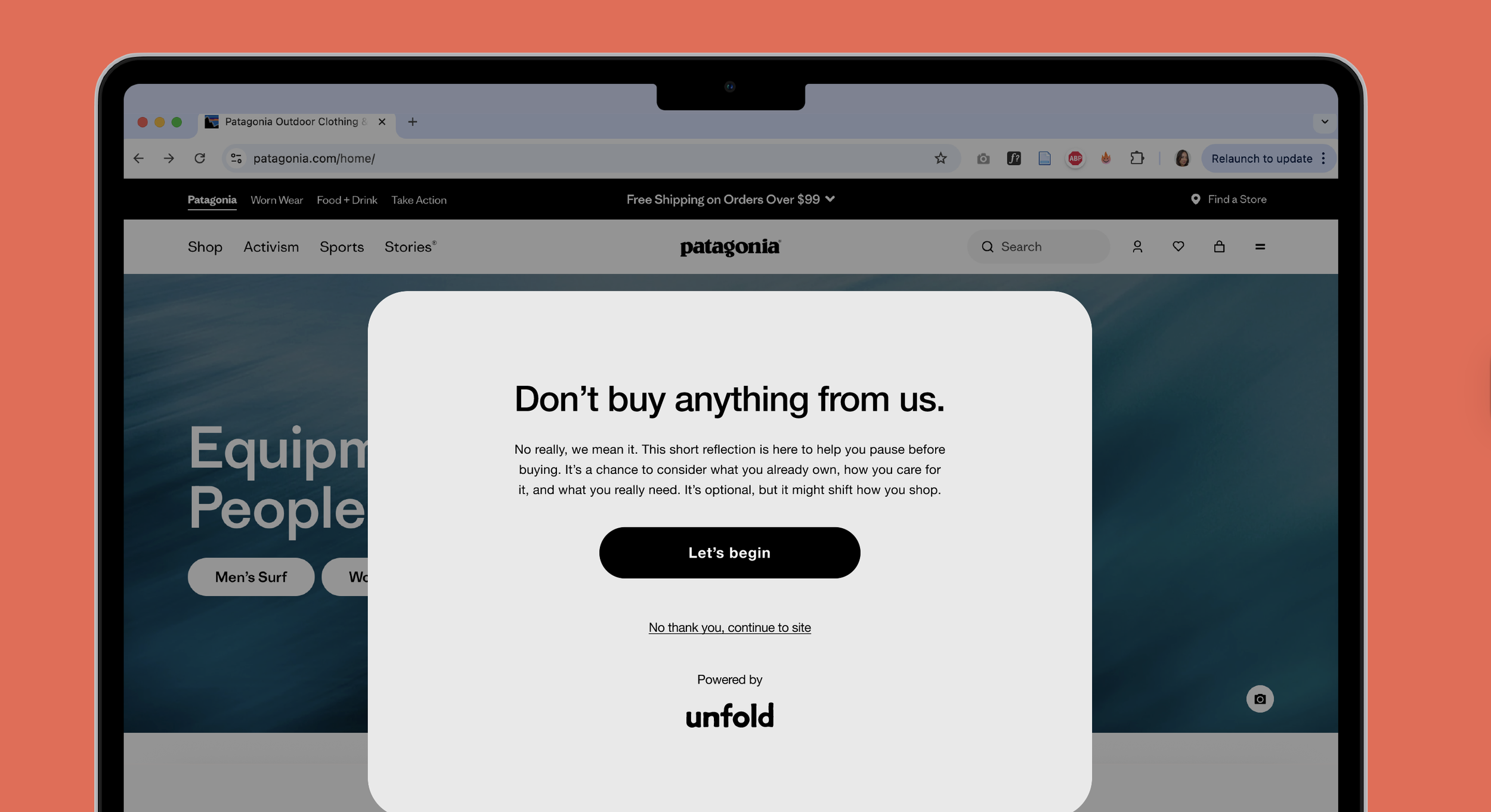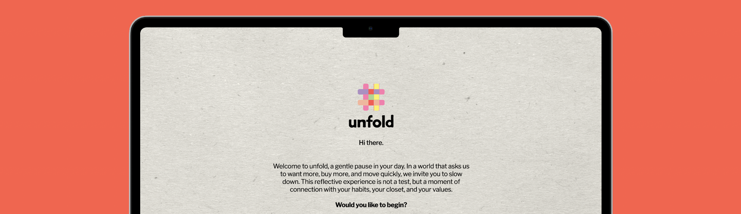 Unfold is a Chrome extension that pops up when you land on a fashion e-commerce site. Instead of immediately letting you browse, it guides you through a short reflection. Depending on your answers, it offers alternatives like: