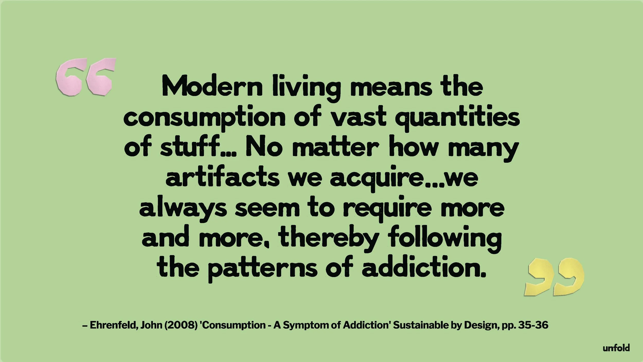 Ehrenfeld, John. “Consumption – A Symptom of Addiction.” Sustainable by Design: A Subversive Strategy for Transforming Our Consumer Culture, Yale University Press, 2008, pp. 29–43.