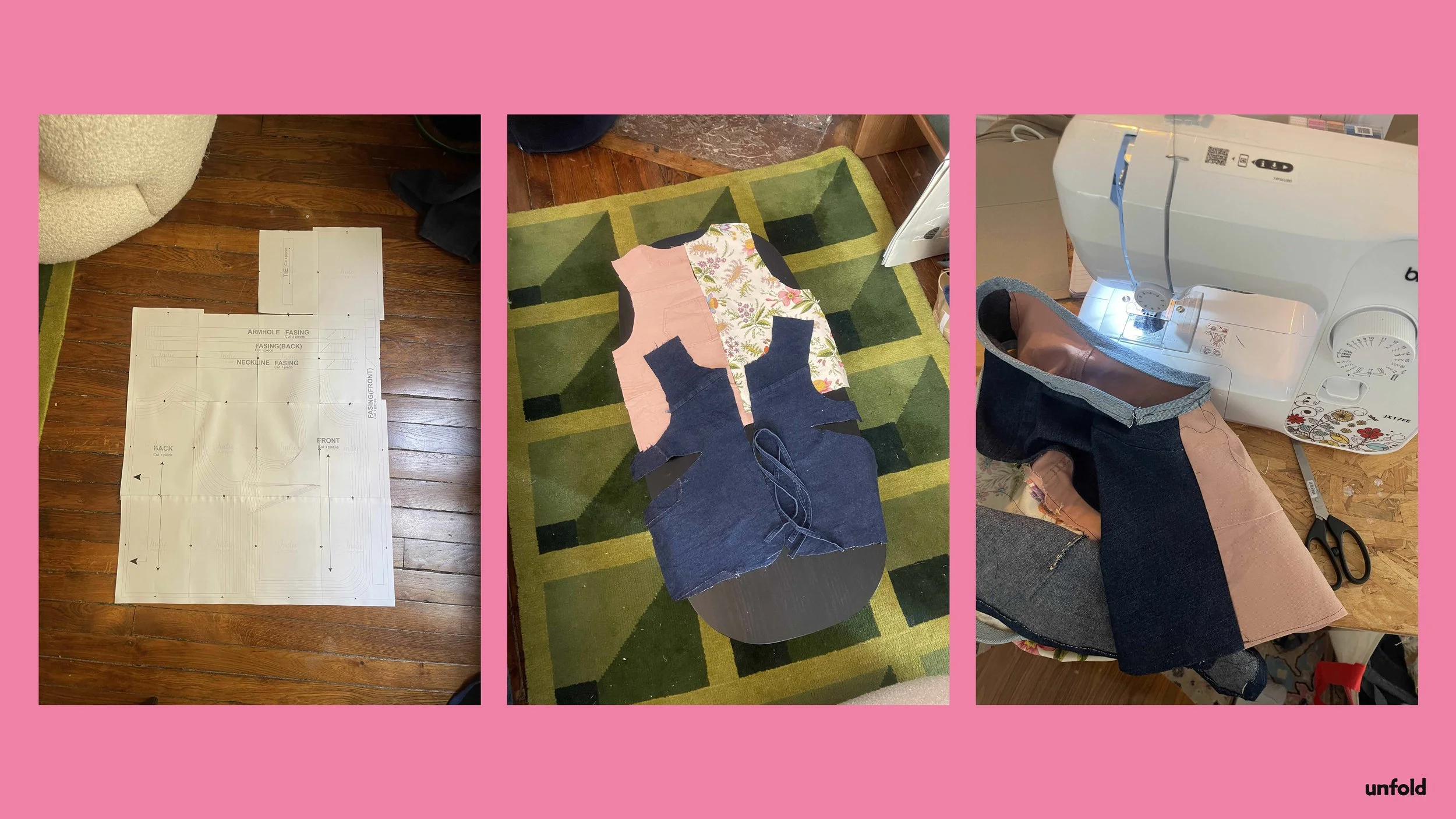 To test the idea, I challenged myself to make a garment using only upcycled skirts. I printed and taped together a pattern, then cut the fabric around existing seams, zippers, and buttons. It forced me to be strategic with every piece.